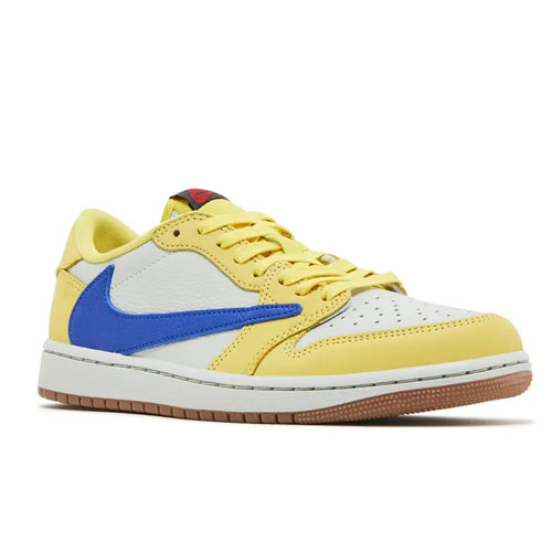 Inspired by the colors of Travis Scott's alma mater, Elkins High School, the Travis Scott x Women's Air Jordan 1 Retro Low OG SP 'Canary' sports Scott's signature reverse Swoosh in Racer Blue, which embellishes the side panel. A white leather upper gets contrasting yellow forefoot and heel overlays for a bold look. A red-and-black Nike Air tag decorates the tongue, while Scott's Cactus Jack and Jordan Wings logos are embroidered on each heel tab. These sneakers have a traditional cupsole, accompanied by white textured sidewalls and a gum rubber outsole.