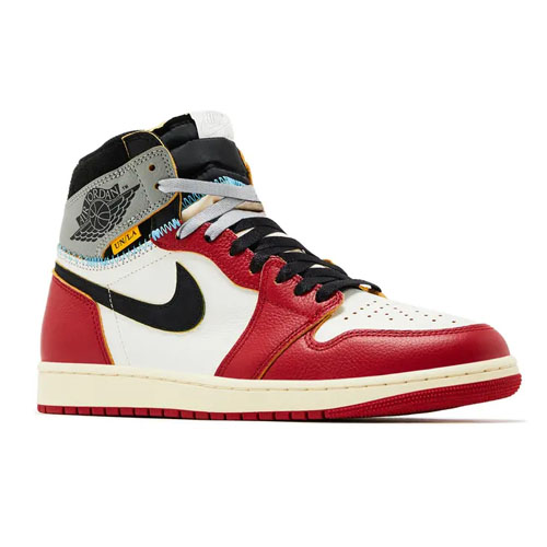 The Union LA x Air Jordan 1 Retro High OG SP 'Chicago Shadow' combines two OG colorways. Part of the upper is based on the original 'Chicago' colorway, using a white leather upper with contrasting red overlays and a black Swoosh. Separated via exposed zigzag stitches, the collar borrows from the AJ1 'Shadow,' complemented by grey overlays on a black background. The opposite side gets a Wings logo and a yellow 'UN/LA' label, while a Nike Air tongue tag adds to the signature look. A vintage-style midsole finishes the look.