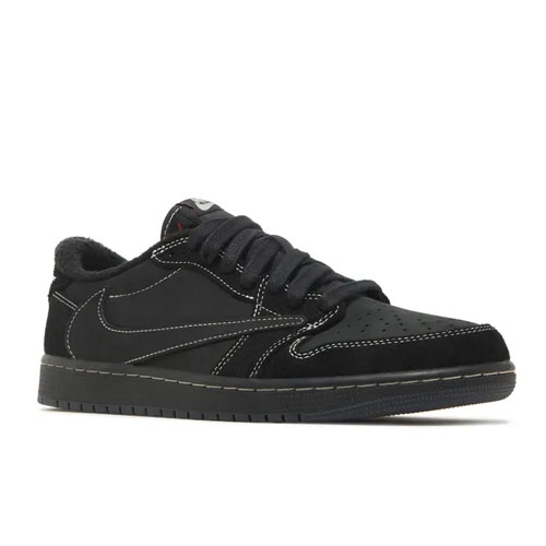 The Travis Scott x Air Jordan 1 Retro Low OG SP 'Black Phantom' sees the Houston-based rapper color up another AJ1 Low. This iteration features a blacked-out look, with nubuck and suede on the upper underscored by white contrast stitching throughout. Scott's signature reverse Swoosh remains, alongside a regular Swoosh on the medial side with Cactus Jack branding. The back heel features mismatched branding, with a Wings logo on the right shoe and a bee graphic on the left.