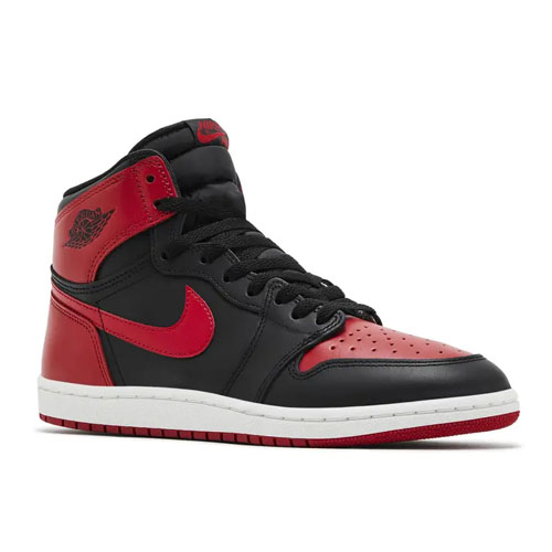 The 2025 version of the Air Jordan 1 Retro High '85 OG 'Bred / Banned' tries for a true OG look, keeping the high collar and wider toe box. The leather upper blends black and red panels on the toe, heel, collar and the Swoosh. The Wings logo adorns the collar, while a woven Nike Air tag graces the tongue. A traditional rubber cupsole with white sidewalls contrast the red outsole to wrap up the look.