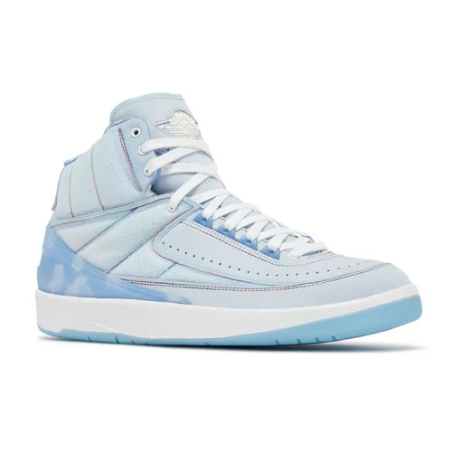 The Air Jordan 2 Retro gets a colorful makeover by Colombian reggaeton artist J Balvin. The upper is crafted with powder blue ripstop material and grey suede accented by multicolor stitching, while an all-over graphic featuring cloudy blue skies can be seen on the heel counter and interior lining. J Balvin's signature smiley face graphic is affixed on the back heel, while the Wings logo on the tongue has a glow-in-the-dark finish. A contrasting white midsole leads to a translucent outsole, while encapsulated Nike Air offers lightweight cushioning.