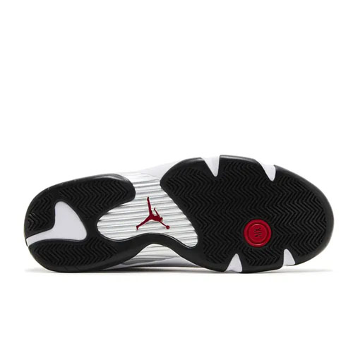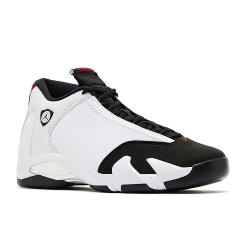 The 2024 edition of the Air Jordan 14 Retro 'Black Toe' sports a white leather upper, highlighted by black suede accents on the toe. The tongue, collar lining and back tab are also black, the latter embellished by a Jumpman logo and a large, stylized '23.' A smaller red Jumpman logo complements the toe box, while a Ferrari-inspired Jumpman emblem decorates the collar. A Phylon midsole is equipped with a chrome-plated shank plate for stability and encapsulated Zoom Air units on the forefoot and heel.